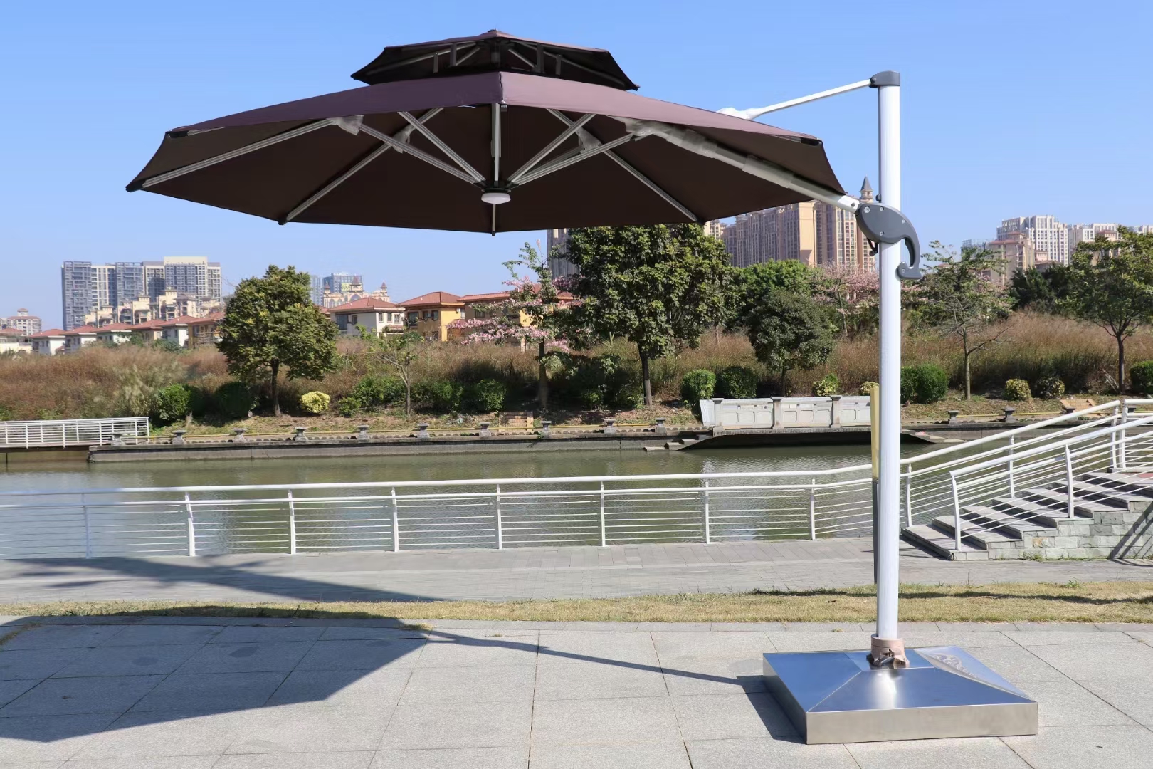 側(cè)柱傘就是說(shuō)柱子在一側(cè)的遮陽(yáng)傘,側(cè)柱傘的類型也很多,分為單邊傘,羅馬傘,香蕉傘等。側(cè)柱傘由于在邊緣上的緣故,視覺上會(huì)感覺傘的面積較大,在側(cè)柱傘下的視覺也比較好,避免了傳統(tǒng)遮陽(yáng)傘在使用桌子上穿孔的麻煩。